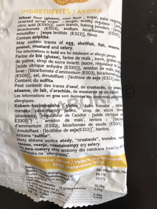 Farine de blé (gluten), sucre, graisse de palme, sirop de sucre inverti, acide citrique (E330), arôme, levure (bicarbonate d'ammonium (E503), bicarbonate de sodium (E500)), émulsifiant (lécithine de soja (E322)), flavor.