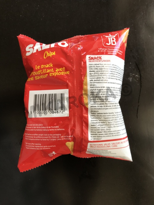 Nutritional value / Valeurs nutritionnelles / 100g: Protein/Protéines/Proteina 6,27g, Carbohydrate/Glucides/Gliosida 56,79g, Fat/Lipides/Menaka 0,25g, Salt/Sel/Sira 13,99g, Energy/Valeur énergétique/Hery 489,12kcal/2,04kJ.