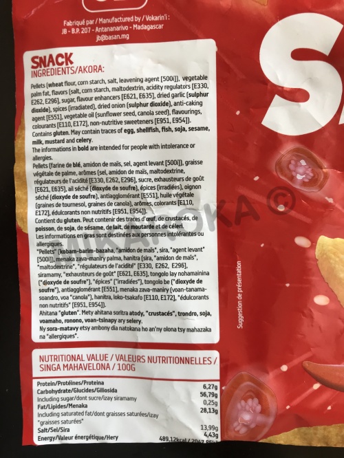 Pellets (wheat flour, corn starch, salt, leavening agent [500]), vegetable palm fat, flavors (corn starch, maltodextrin, acidity regulators [E330, E296], sugar, flavor enhancers [E621, E635], dried garlic (sulphur dioxide), spices (irritated), dried onion (sulphur dioxide), anti-caking agents [E551], vegetable oil (sunflower seed, canola seed), flavourings, colorants [E110, E172], non-nutritive sweeteners [E951, E954]. Contains gluten. May contain traces of egg, shellfish, fish, soja, sesame, milk, and nuts.