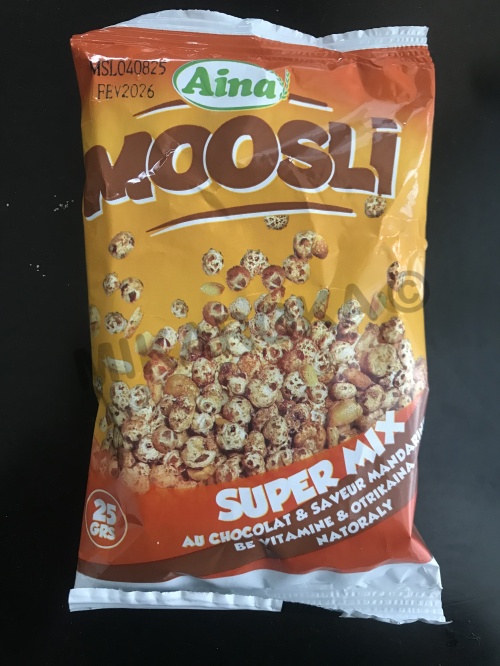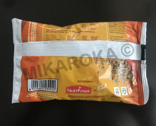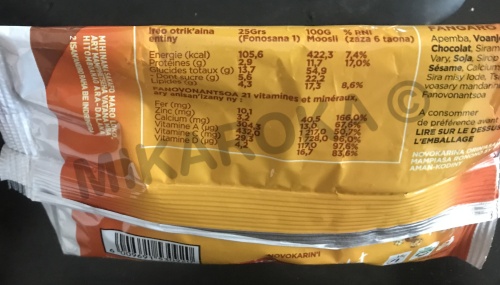 Farine de maïs, Sucre, Chocolat, Sirops, Vary, Soja, Sirop de glucose, Sésame, Calcium, Sira misy lody, Tsiro, Vosaary mandarina, Fanovonanantsika
