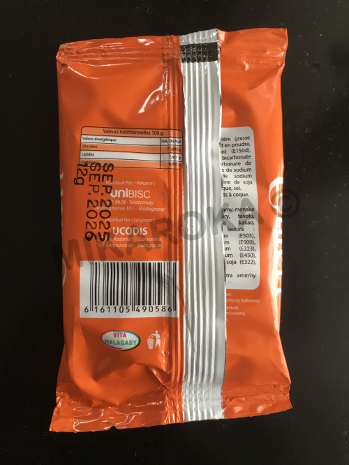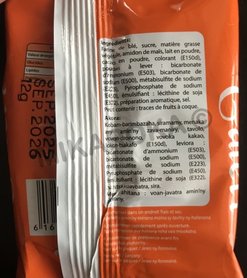 matière grasse végétale, sucre, farine, poudre, lait en poudre, agent levant (E500d), bicarbonate de sodium, sel, émulsifiant (E322), arôme, colorant (E150d), conservateur (E202), levure